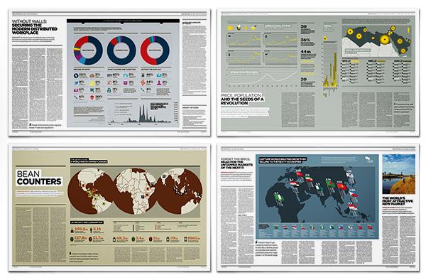 a series of infographics / dashboards / information visualization for raconteur developed weekly 16-20 page special interest report supplement in the Times newspaper.