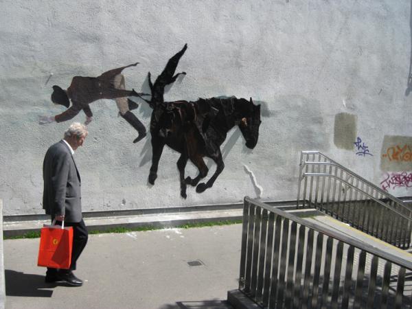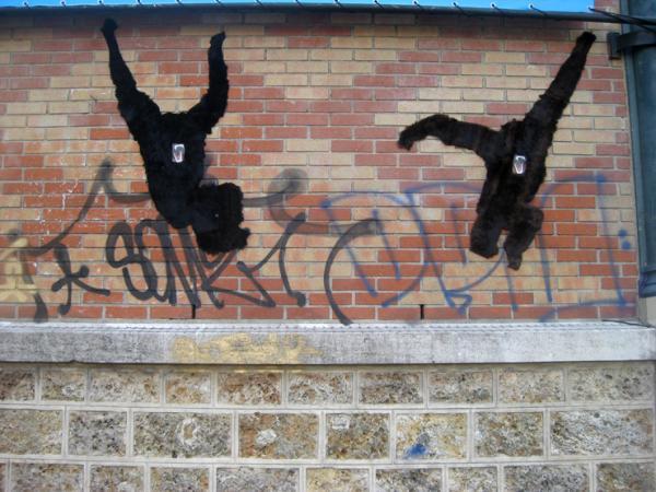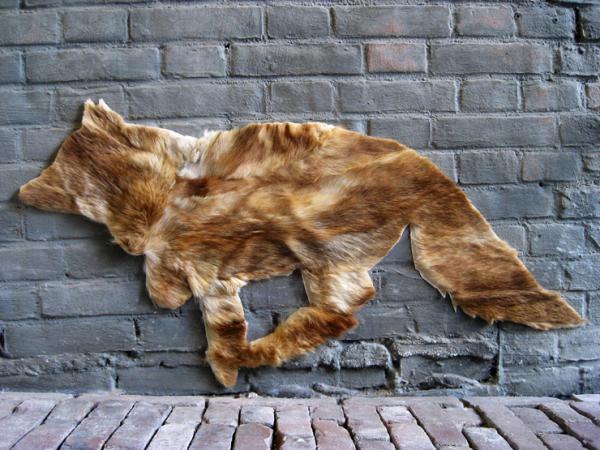 The artistic collaboration neozoon requires discarded fur coats, turning them into street art. Scouring thrift shops for animal fur fashion cast-offs, once more neozoon purposes the fur coat panels in animal-shaped silhouettes, which are then plastered on city walls.